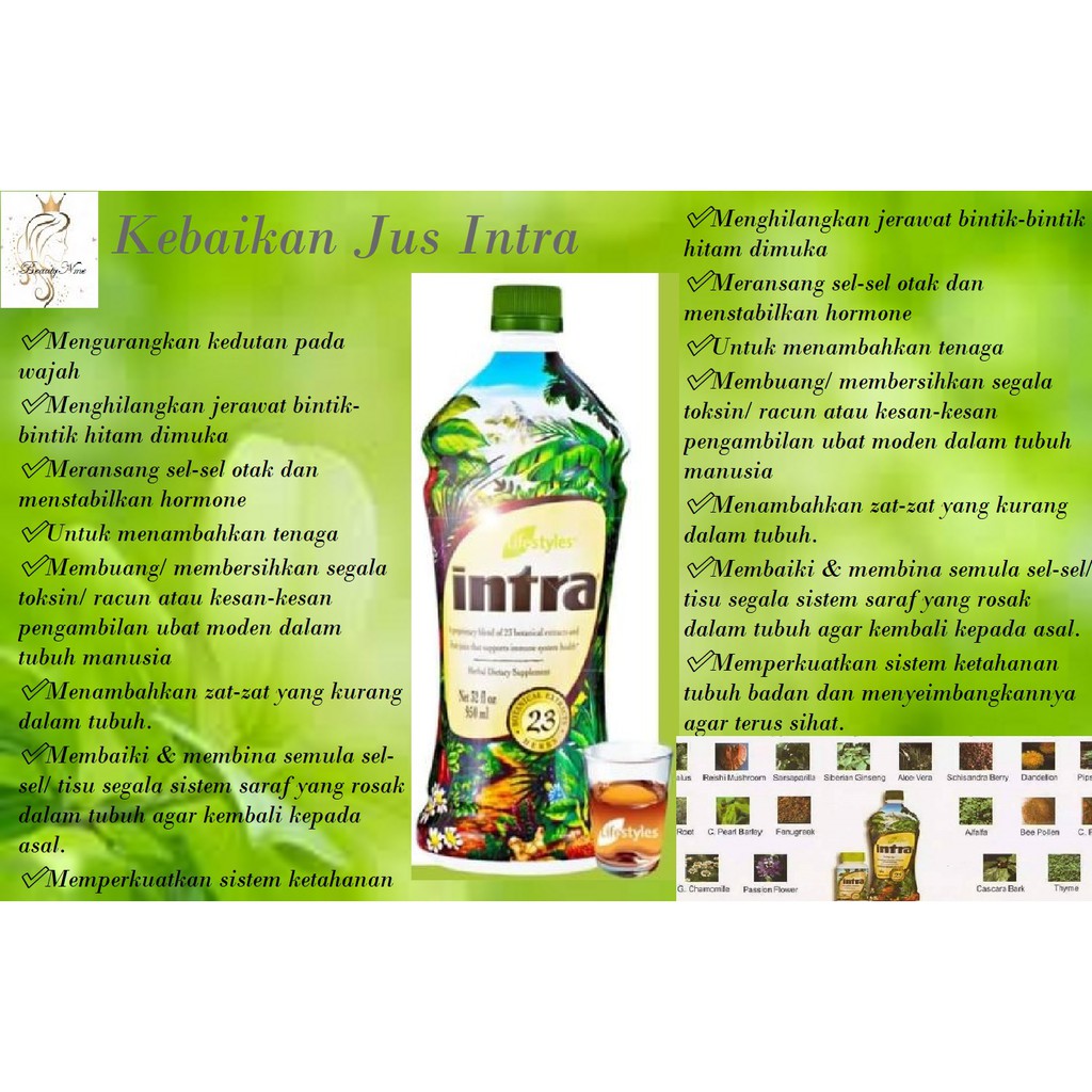 Inginkah anda kelihatan muda semula. Mengandungi 23 jenis herba semulajadi dari pati yang bermutu tinggi. 36 daripada Jus buah anggur dan lai pear yang digunakan adalah sebagai pemanis dalam Intra amat lazat rasanya.