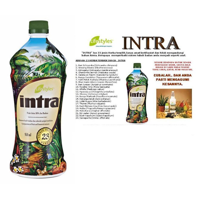Kebaikan jus intra. Jus intra 23 herba terbaik di dunia Jus 23 Herba hasil dari ilmu Perubatan Tradisi Islam Cina lain-lain negara digabungkan dengan teknologi dari barat. Hanya RM13800 dan hadiah misteri menanti anda sekiranya anda membeli 3 botol. Jus Intra dapat memperkuatkan sistem ketahanan tubuh badan dan mengimbangkan agar anda sentiasa sihat dan cergas.