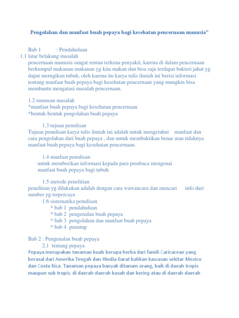 Makalah tentang manfaat buah pepaya bagi kesehatan. Padahal sebenarnya ada beragam manfaat lain dari buah pepaya dan baik untuk kesehatan tubuh antara lain. Bagi peneliti penelitian ini dapat menambah pengetahuan dan keterampilan tentang pemanfaatan buah tomat sebagai bahan selai dan pemanfaatan buah pepaya sebagai pektin atau bahan untuk pembuatan selai. Tanaman ini dimanfaatkan buahnya untuk dikonsumsi karena sifatnya yang manis dan menyegarkan.